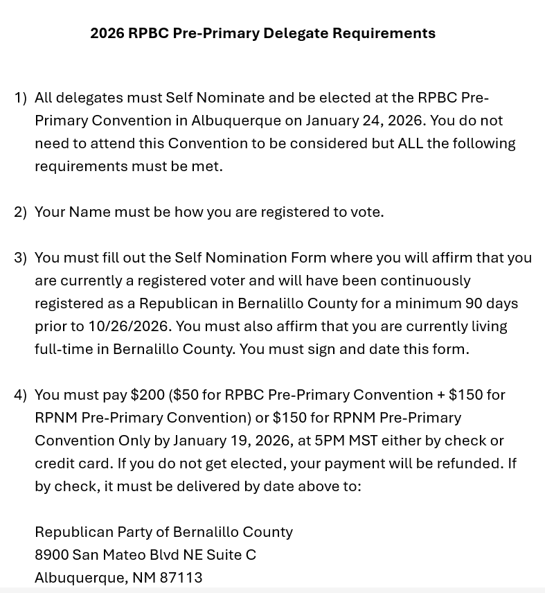 Delegates elected to the State Pre-Primary Convention are responsible for all fees and expenses at the convention to be held March 7, 2026, in Ruidoso, NM.